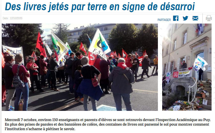 Pendant les discours, les personnes présentes ont déposé de vieux manuels scolaires à même le sol pour protester sur les conditions d’accueil des enfants en Haute-Loire ainsi que sur cette destruction sauvage du savoir que les instances gouvernementales opèrent depuis quelques temps. « L’administration insiste pour dire que la Haute-Loire serait un département privilégié par rapport à d’autres départements, chose que nous récusons totalement ! », dénonce les syndicats.