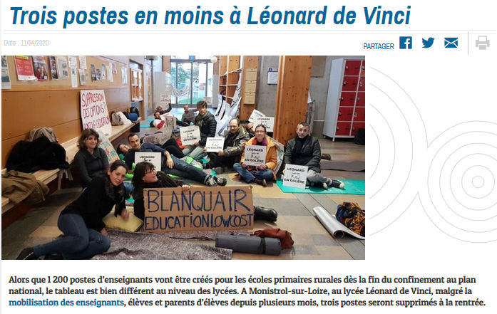 Nous avons adressé le 29 mars, une nouvelle fois, une demande de rendez-vous au Recteur, dans l’espoir d’obtenir une entrevue par visioconférence concernant la rentrée 2020 au lycée Léonard de Vinci de Monistrol-sur-Loire. Cette requête lui a déjà été adressée trois fois (24/01, 31/01 et 10/03) et est restée lettre morte.